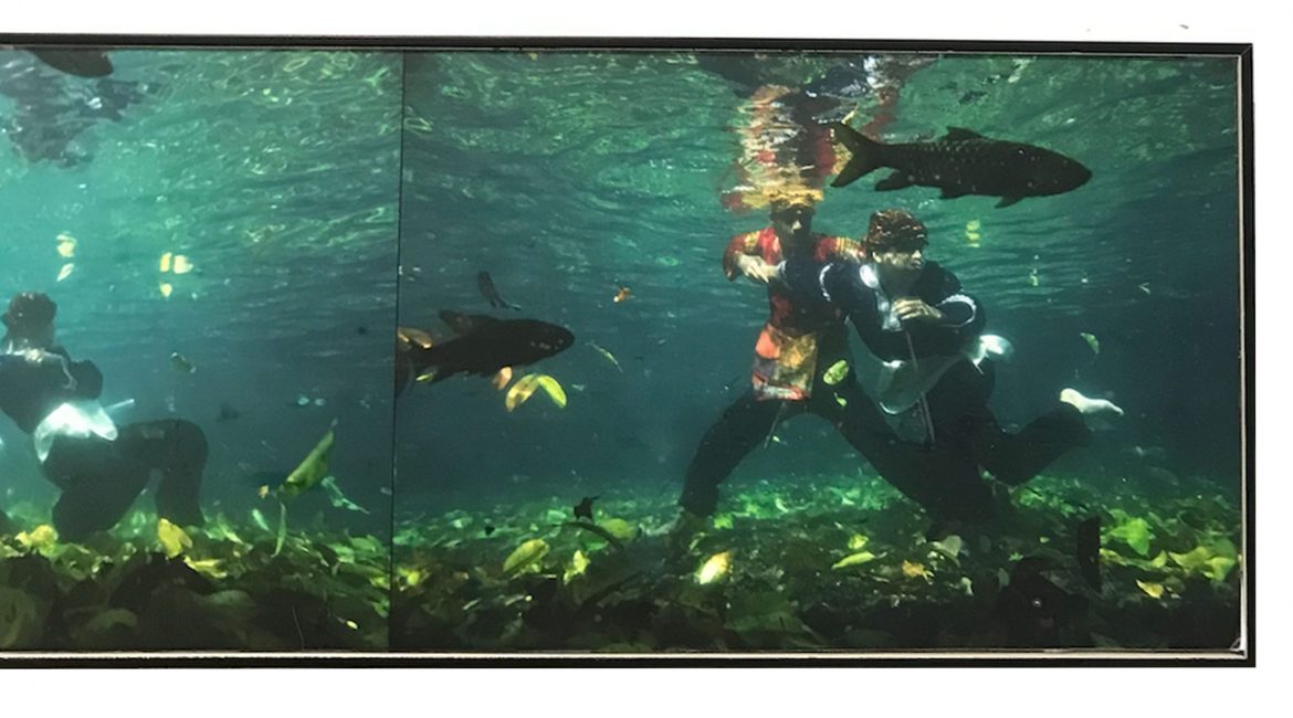 Inilah salah satu pertanyaan yang mendorong saya untuk mengunjungi pameran tersebut. Saya mendapati puluhan foto Silat Kumango dicetak dan dibingkai dalam berbagai ukuran. Sejumlah foto disusun kolase dalam satu bingkai. Beberapa yang lain ditampilkan secara sekuens. Di bawah foto ada keterangan jenis kertas dan ukuran cetak foto. Selain itu hanya ada teks pendek tentang nama gerakan atau barangkali nama jurus silat yang ditampilkan pendekar di bawah air itu. Alih-alih menemukan jawaban, pertanyaan awal yang saya bawa jadi berlipat ganda.